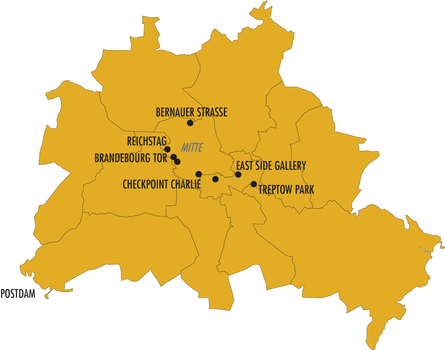 Itinéraire: Ville-ouest (Kurfürstendamm, Kaiser Wilhelm, Gedächtniskirche, Bikini-Berlin, KaDeWe, ...), Parc Tiergarten, Siegesäule, Château de Bellevue, Haus der Kulturen der Welt, le Palais du Reichstag, quartier gouvernemental, nouvelle gare, Porte de Brandebourg, Mémorial de l’Holocauste, Unter den Linden, Spree-eiland, Alexanderplatz, Karl Marx Alle (architecture soviétique), Le monument russe dans le parc de Treptow, L’east-side-gallerie (le tronçon de mur le plus long et le plus éloigné), le quartier de Nikolaï (Morceau de la “Altstadt” reconstruite), Musée Juif, Checkpoint Charlie, “Topographie de la Terreur”, Potsdamer Platz, “Forum culturel” avec la Philharmonie et la Nouvelle Galerie Nationale, en passant par le Centre de documentation murale dans le “Bernauer Straße”, ...