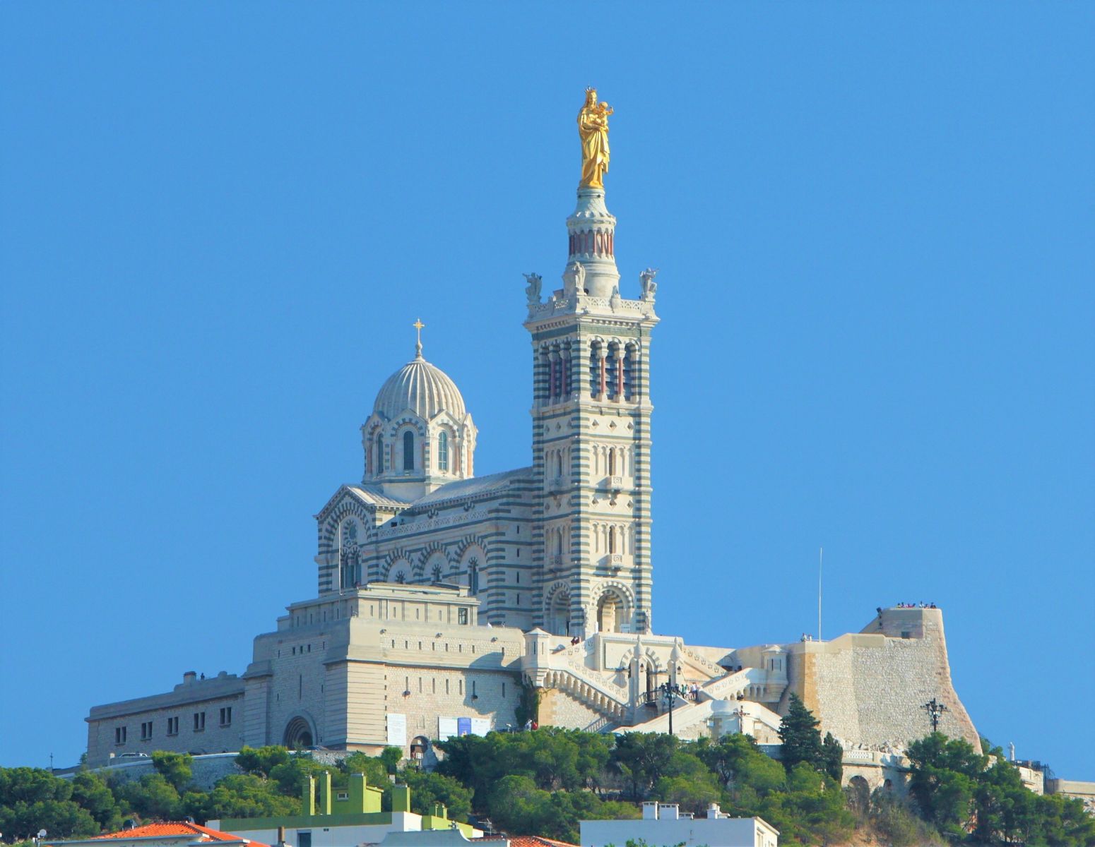 Ensuite, nous monterons à Notre Dame de la Garde avec un petit train : la 'Bonne Mère de Marseille', une figure emblématique de Marseille qui veille sur tous ses habitants, marins et pêcheurs compris. Elle offre également une vue unique sur la ville et les îles du Frioul.