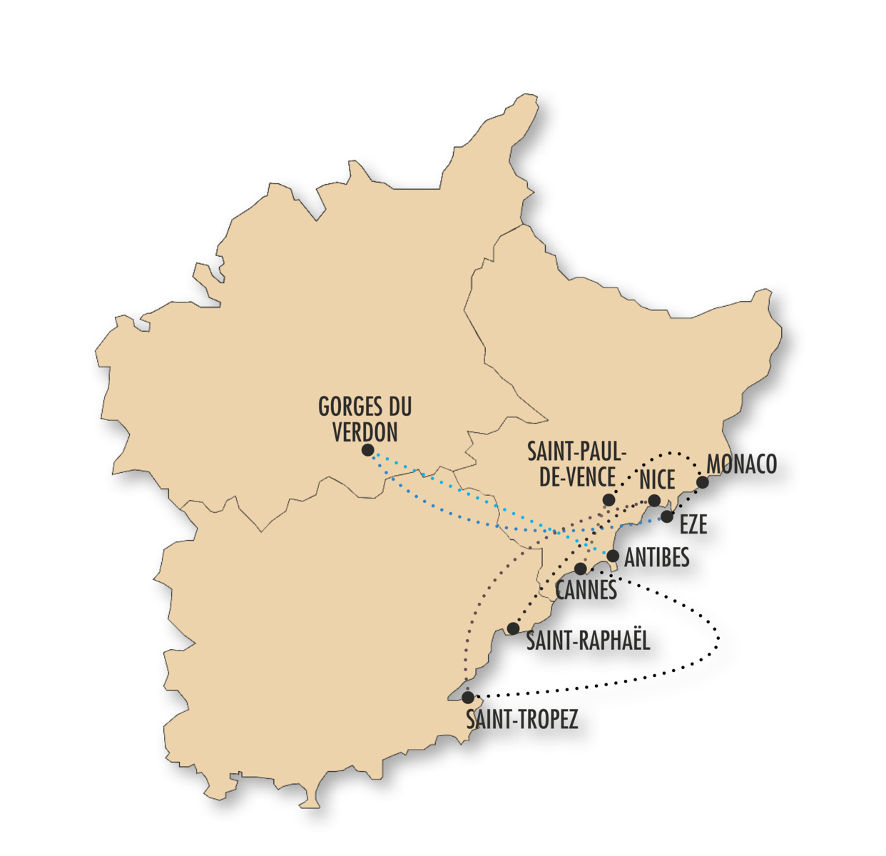 Découvrez les villes les plus mythiques de la Côte d’Azur lors de cette visite guidée. Découvrez le Rocher, flânez sous le soleil de Saint-Tropez et promenez-vous sur la Promenade des Anglais. Admirez les magnifiques Gorges du Verdon ainsi que de nombreux autres sites uniques et fantastiques. Au départ de Saint-Raphaël, vous découvrirez les plus belles routes du sud à bord d’un confortable autocar Grand Tour.