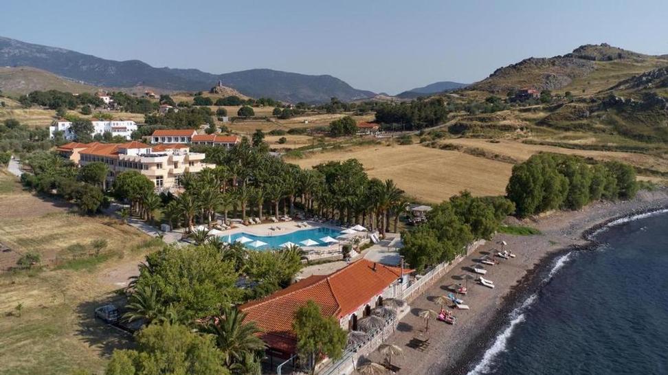 Au calme, proche de la plus longue plage de l’île. Un petit marché se trouve à 300m tandis qu’un supermarché à 900m. Service de bus vers Mytilène (distance de 50km, uniquement en haute saison). Une voiture de location est fortement recommandée. L’aéroport est à environ 1h de route.