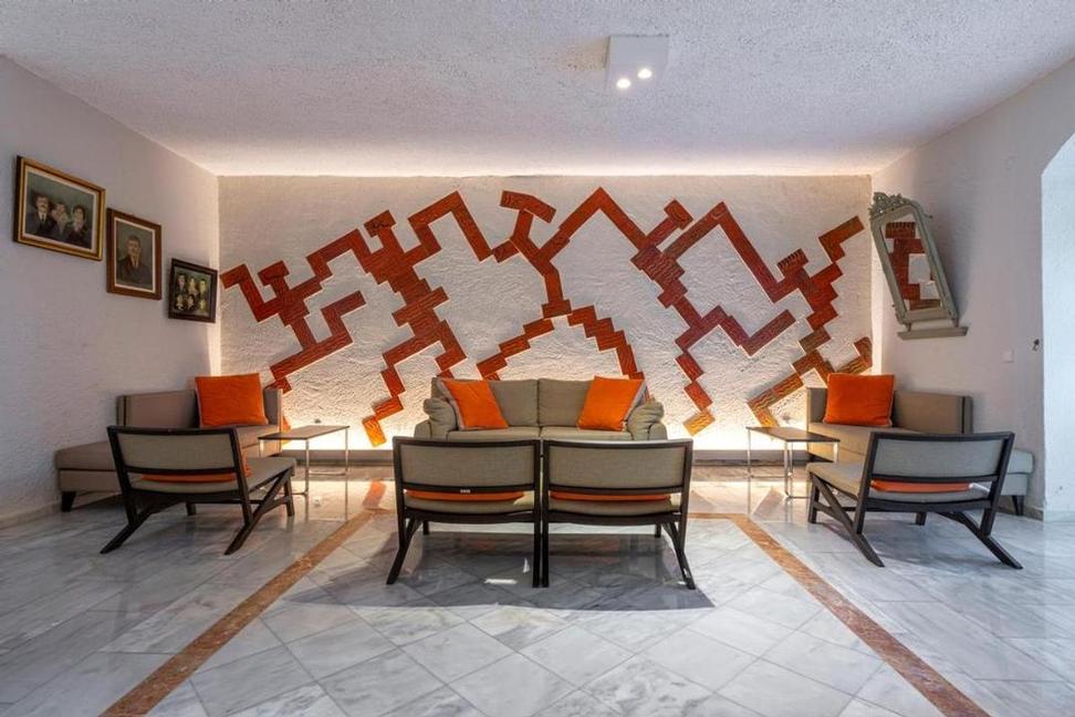 Lobby, réception, WIFI, bibliothèque, salle de petit déjeuner avec buffet petit-déjeuner, salles de réunion (jusqu'à 400 personnes), piscine (eau de mer) avec chaises longues et parasols, beau jardin de fleurs.