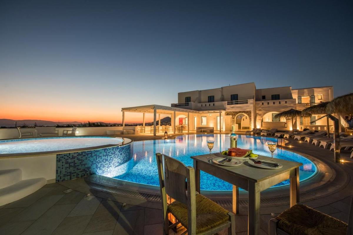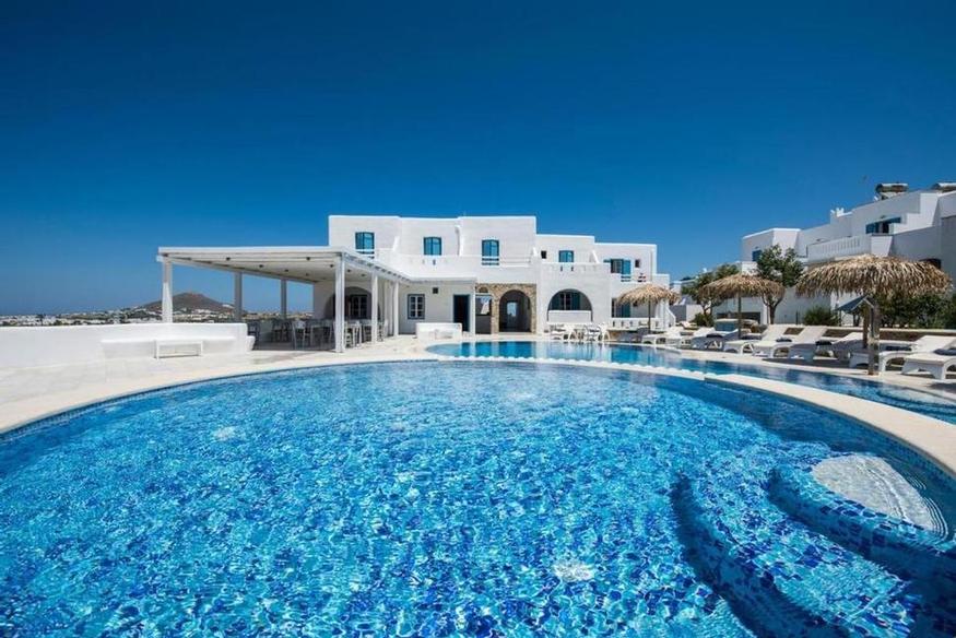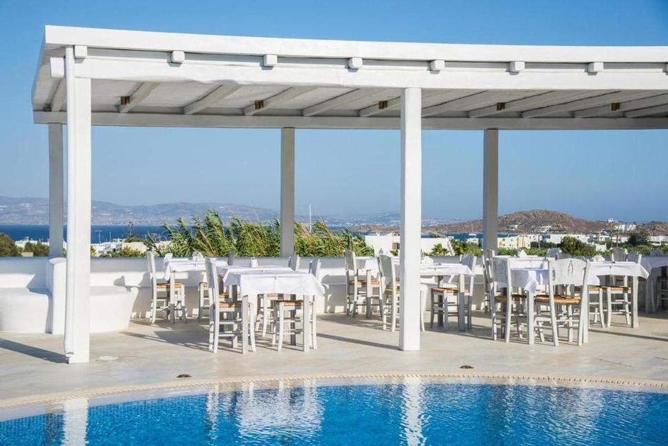 Buitenzwembad, snackbar, zandstrand met ligstoelen en parasols (betalend) en sportfaciliteiten op het aangrenzende strand van Plaka, gelegen op 800 meter van het hotel.