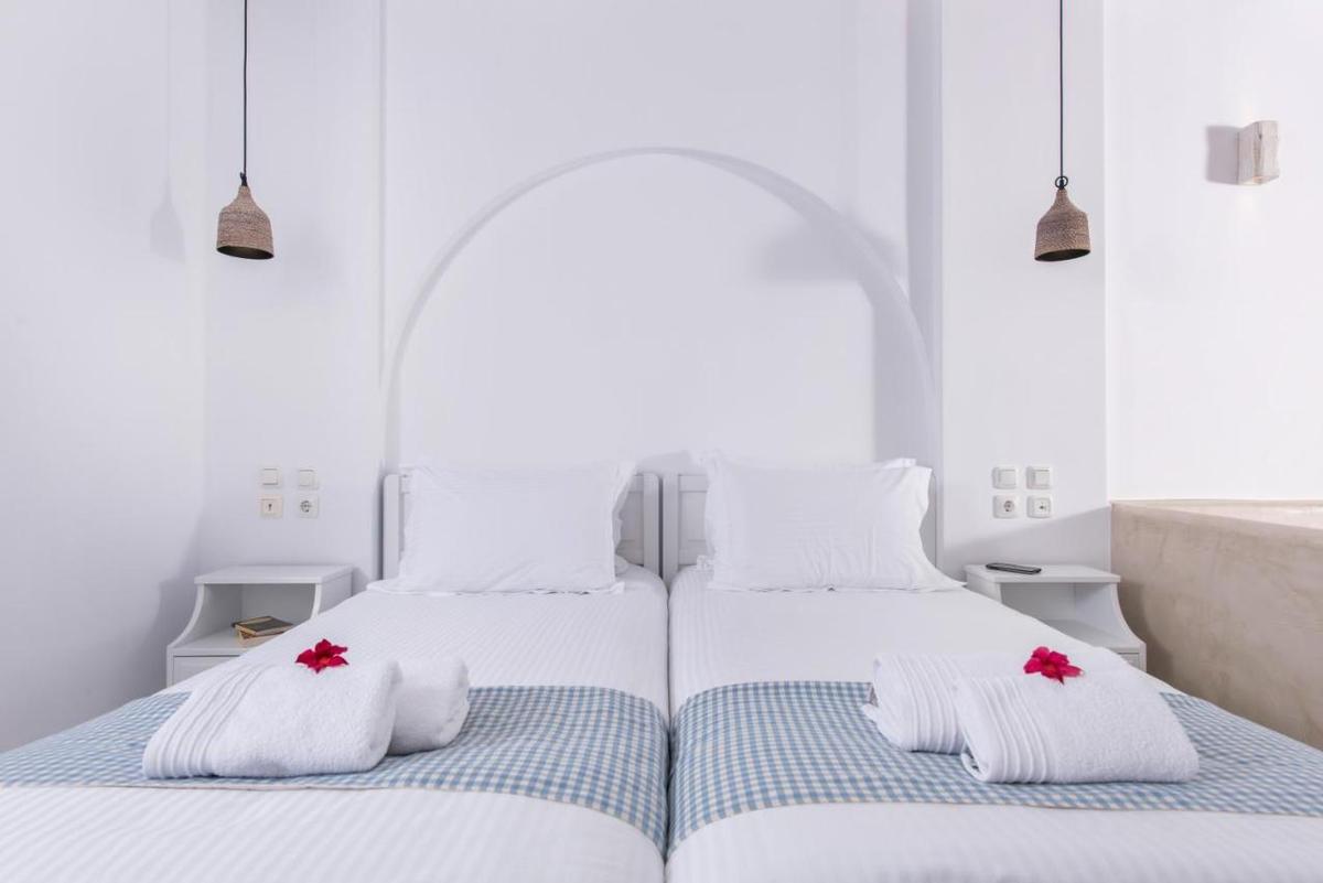 Het hotel beschikt over 15 kamers verdeeld over 2 verdiepingen. Alle kamers zijn zeer smaakvol ingericht in typisch Cycladische stijl en zijn uitgerust met airconditioning, satelliet-tv, wifi, kluis, koelkast, waterkoker, badkamer met douche, toilet, haardroger en een balkon of een terras met zicht op de straat of zeezicht (betalend).