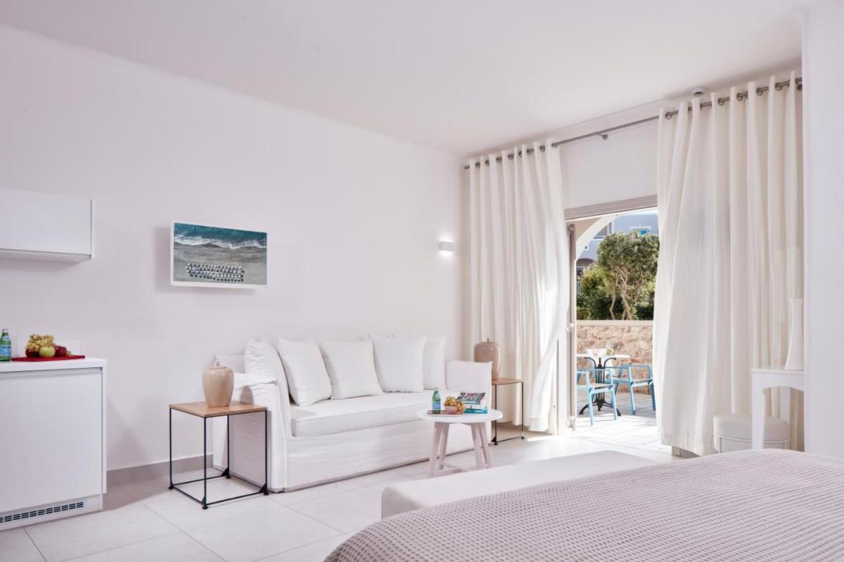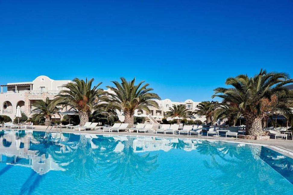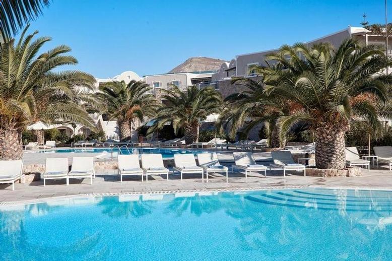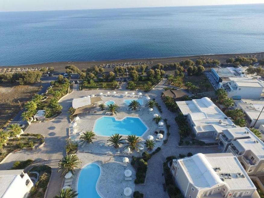 Rustig gelegen aan de rand van Perívolos, tegenover het zwarte zandstrand met zijn verschillende tavernes, bars en restaurants. Het centrum van Períssa ligt op ongeveer 2,5 km. Rechtover het hotel is de bushalte richting Firá (ongeveer 12 km). De luchthaven ligt op 40 minuten en de haven op 30 minuten rijden.
