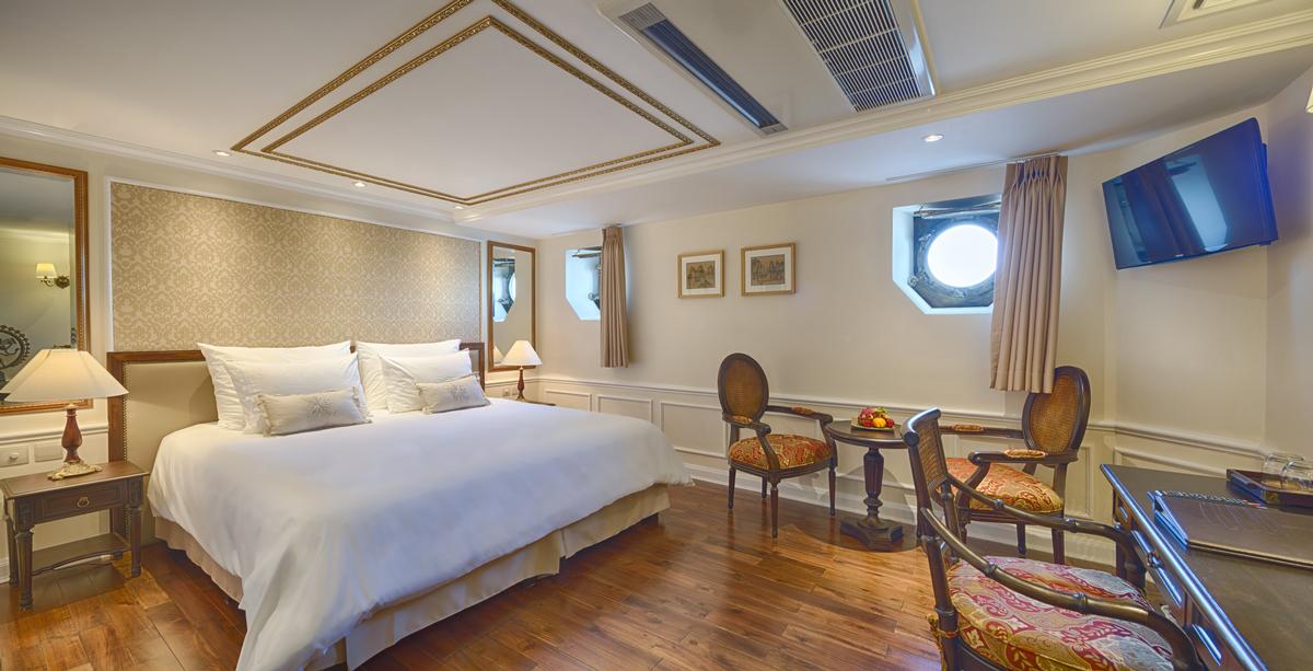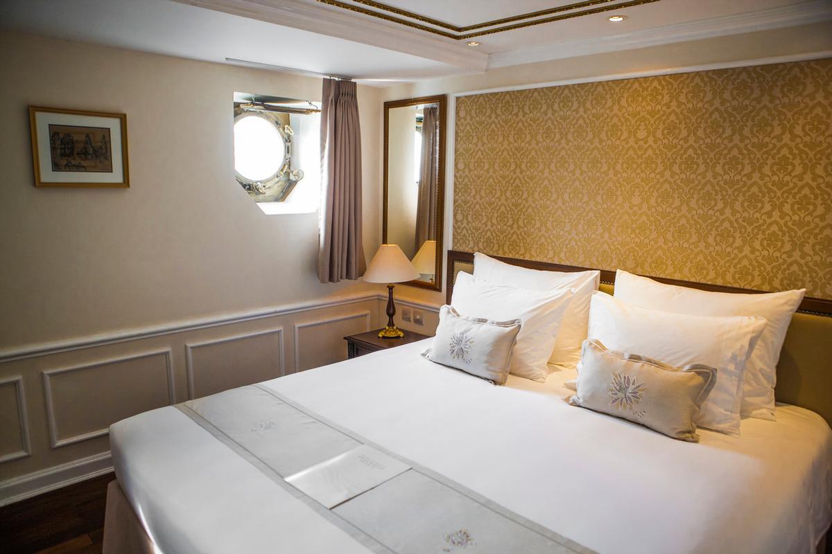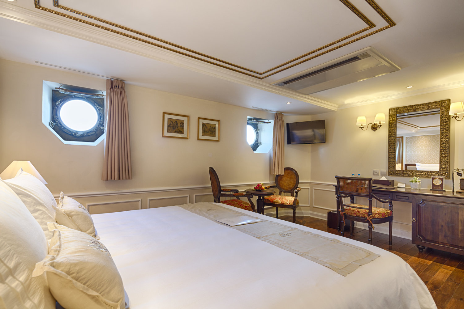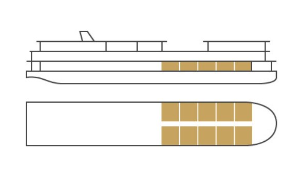 Chacune des élégantes suites climatisées du navire est une retraite magnifique et tranquille avec une touche de luxe. Cinq catégories sont proposées : quatre Suites Supérieures, 10 Suites Vista, 16 Suites Signature, deux Suites Prestige et deux Grandes Suites avec véranda privée. (34 cabines). Chacune dispose d'une salle de bains en marbre avec douche.