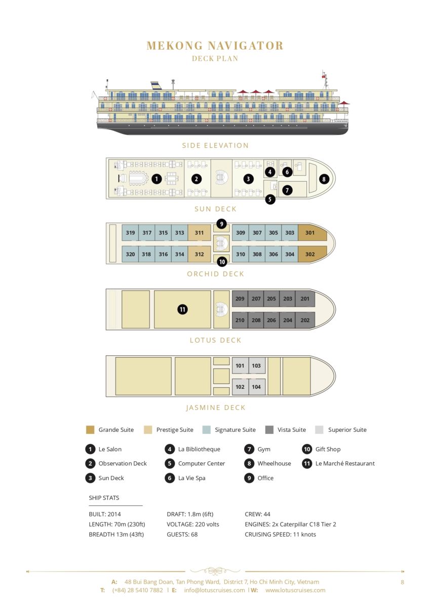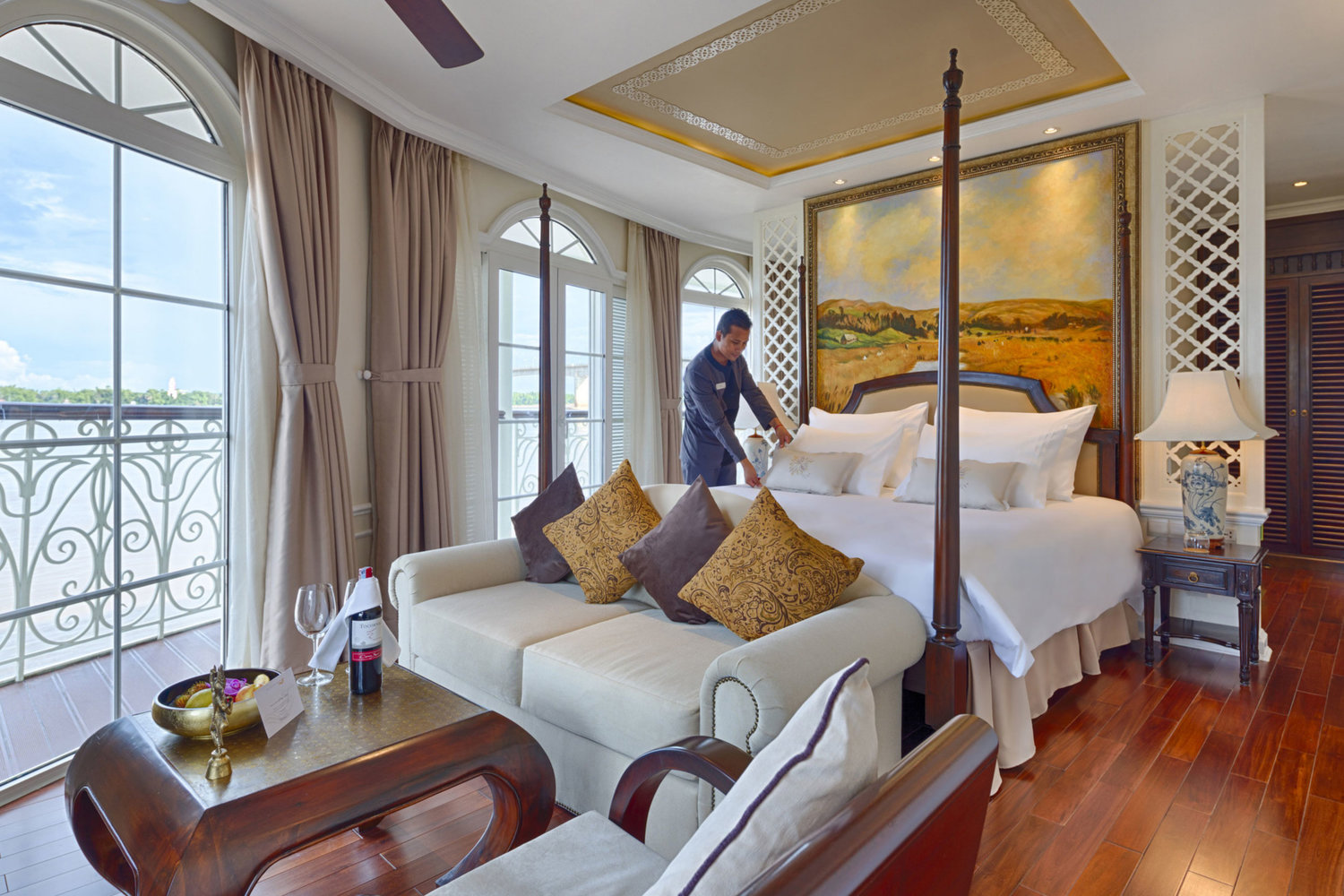 Naviguant à travers le Vietnam et le Cambodge, Mékong Navigator est un bateau fluvial de 34 suites, doté d'un restaurant, d'un bar et d'un salon, d'une terrasse, d'une bibliothèque, d'une salle de sport bien équipée et d'un spa relaxant. Le navire est conçu dans un splendide style colonial français, et avec un ratio équipage/passager de 2:1, il offre un service attentionné et personnalisé de la part d'un personnel impeccablement formé. Le fort engagement de l'entreprise envers la durabilité environnementale garantit que votre croisière est une expérience enrichissante.
